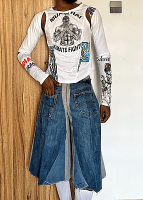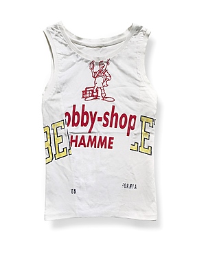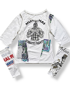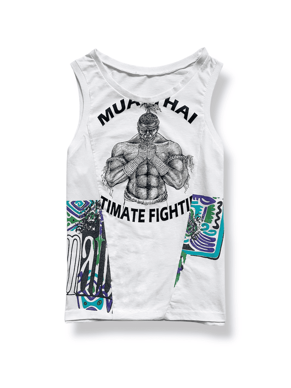 Unisex tank featuring repurposed graphic panels from discarded Tees with an attachable vented sleeve addition carrying graphic panels. This cool one off ism would be an easy versatile number for your everyday elevated.