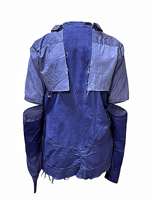 Made entirely from discarded buttoned down shirts. This shirt features paneling of reconstructed parts from the pre-existing garments carrying assemblages of reinforced shoulder detailing as an homage to armors framing a standing collar as well as a vented sleeve, reflecting characteristic hand-dyed reaction due to the varying fabric compositions of the initial garments.